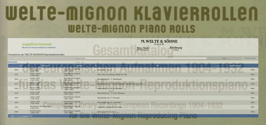 Eine beeindruckende Arbeit der Herren Schmitz und Dangel mündete in den ersten vollständigen Welte Notenrollen-Katalog. Dazu gibt es auch eine Online Datenbank, in der alle Notenrollen aufgeführt sind, und nach Komponisten, Pianisten, Musikstücken und mehr recherchiert werden kann. Wir haben für viele weitere Rollentypen wie Hupfeld, Philipps, Empeco etc. nahezu komplette Rollenlisten erstellt und können bei Bedarf Auskunft zu Details geben.